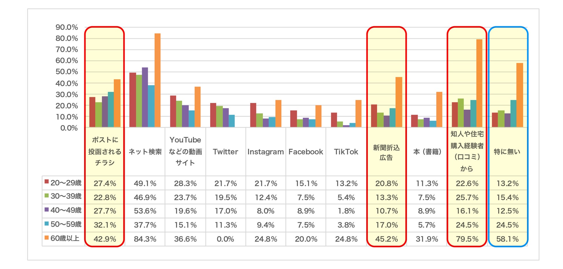 ③住宅購入に関する情報収集手段では、「ネット検索」が各年代最多回答となっていますが、一方で、「ポストに投函されるチラシ」、「知人や住宅購入経験者(口コミ)から」、「新聞折込広告」などのオフライン手法も多く参考にしている傾向が見られます。