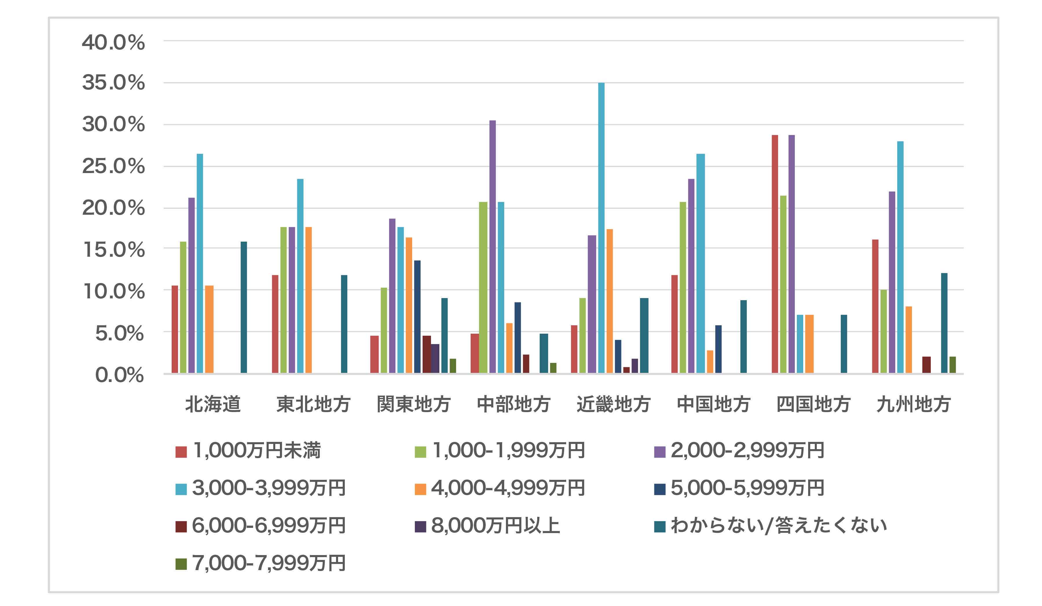 地域ごとの購入金額も見てみますと、北海道、東北、近畿、中国、九州では3,000万円台と回答した方が最も多く、関東は2,000万円台が最多ですが2,000万円~5,000万円台という回答も多く見られ、5,000万円以上と回答した方も他のエリアでは少数でしたが、関東では一定数存在しています。中部地方は2,000万円台と回答された方が最も多く、四国では1,000万円未満と2,000万円台という回答が同数で最も多い結果になりました。地域によって好まれる居住形態や不動産の価格帯が様々なので購入金額に関しても、市場を反映した形になっていると推測しています。