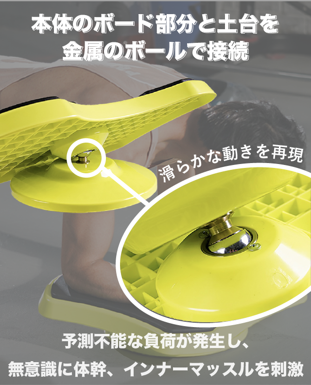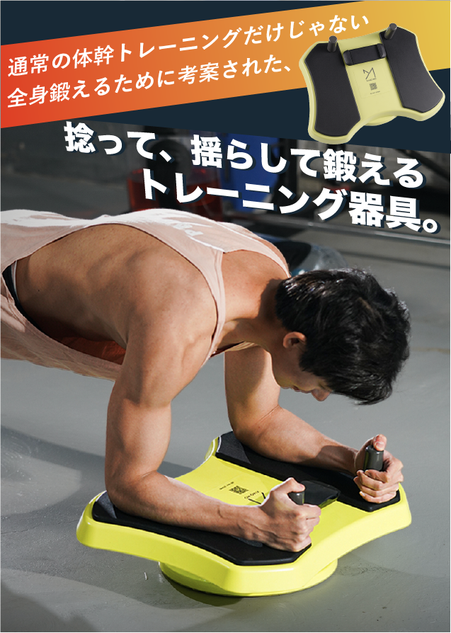 体幹トレーニングの代表である「プランク」に「捻り、揺らし」を加えたエクササイズが可能。