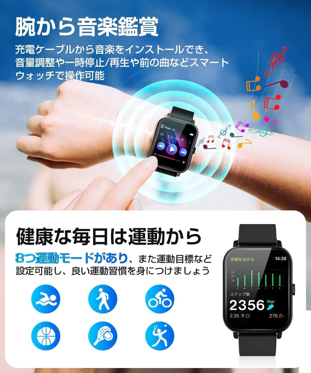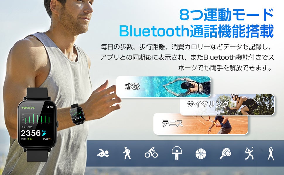 更に、スマートウォッチ本体にウォーキング、ランニング、自転車、バドミントン、テニスなど8つのスポーツモードがあり、体の状態により運動目標を設定して明確な健康管理が実現できます。