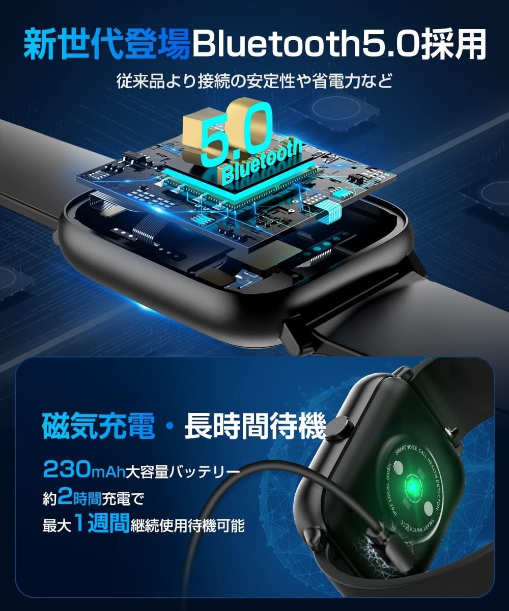 230mAh大容量バッテリーを搭載され、約2時間のフル充電で7日間も持ちます。