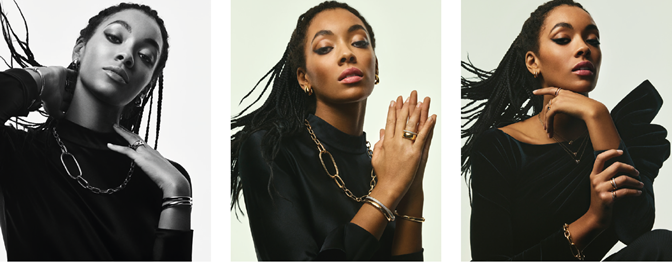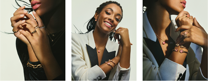 クリエイティブで新世代のシンボルである彼女は、大胆でセンシュアルなゴールドのボリュームとダイヤモンドの輝きを持つ「イコニカ」コレクションをまとい、ミラノの美しさと伝統を表現しています。遊び心あふれるカラフルな「ヌード」コレクションで、彼女ならではのコーディネートを楽しんでいます。ローズゴールドにローズクォーツとブラウンダイヤモンドがあしらわれたバングルをミックスし、彼女の多彩なスタイルに合わせています。