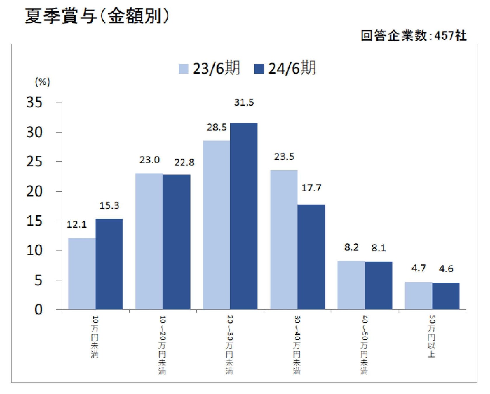 しかし支給額は、「30~40万円」が17.7%(昨年比△5.8㌽)となる一方、「20~30万円」が31.5%(昨年比+3.0㌽)、「10万円未満」が15.3%(昨年比+3.2㌽)となり、金額ベースではやや減少しています。