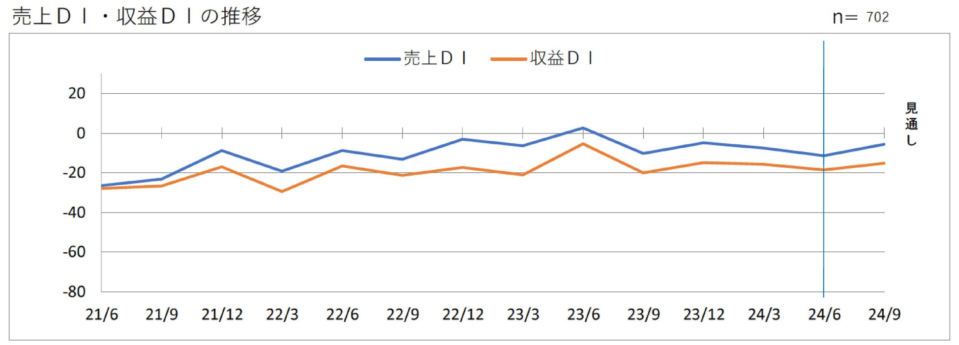 2024年7-9月期は、売上DIが5.7㌽、収益DIが3.4㌽それぞれ上昇すると予想し、インバウンドや万博関連需要、賃上げ効果浸透に伴う個人消費の回復に期待していると思われます。