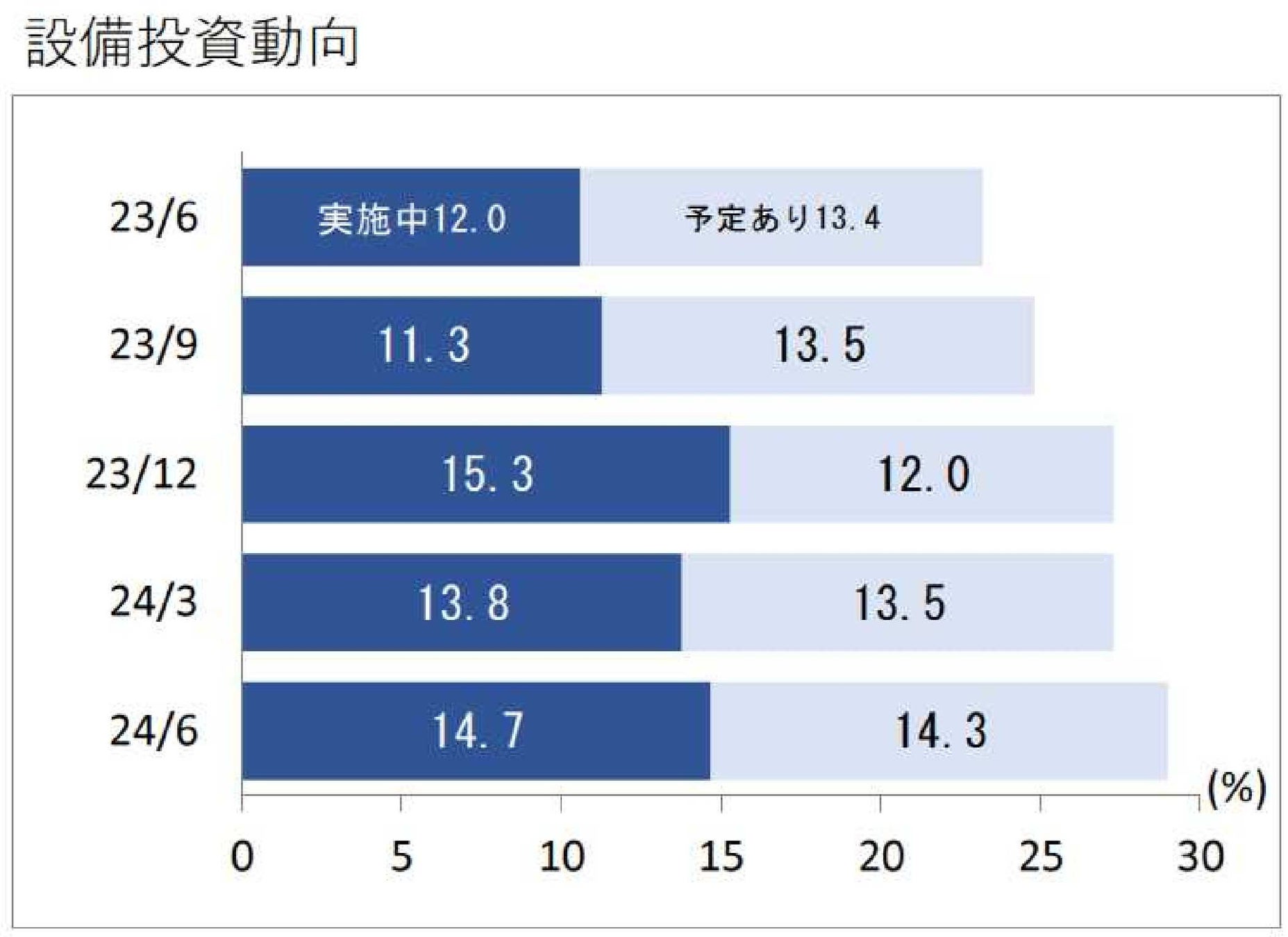 設備投資は、総合では「実施中」が14.7%(前回比+0.9㌽)、「予定あり」が14.3%(前回比+0.8㌽)で合計29.0%となり、堅調な推移を維持しています。特に「予定あり」は、製造業とサービス業が15.7%なる一方、小売業は6.6%となり、業種間でバラツキが見られます。