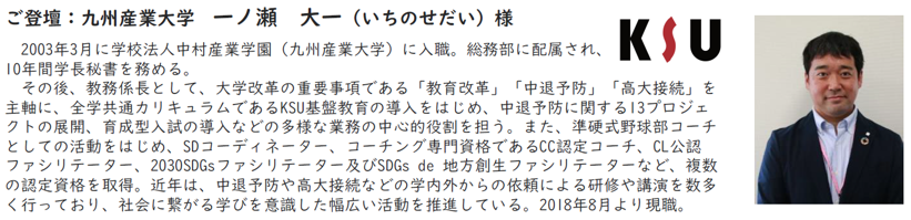 本セミナーにご登壇いただく一ノ瀬大一氏は、九州産業大学にて、大学改革の重要事項である「教育改革」「中退予防」「高大接続」を主軸に、全学共通カリキュラムである「KSU基盤教育」の導入をはじめ、中退予防に関する13件のプロジェクトの展開、育成型入試の導入など、多様な業務の中心的役割を担ってきた学生支援のスペシャリストです。近年は、中退予防や高大接続などについて、学内外からの依頼による研修や講演を数多く行っています。