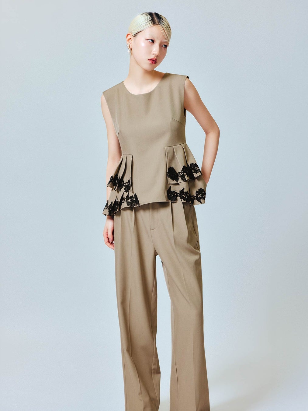 ペプラムトップスとタックパンツのセットアイテム。