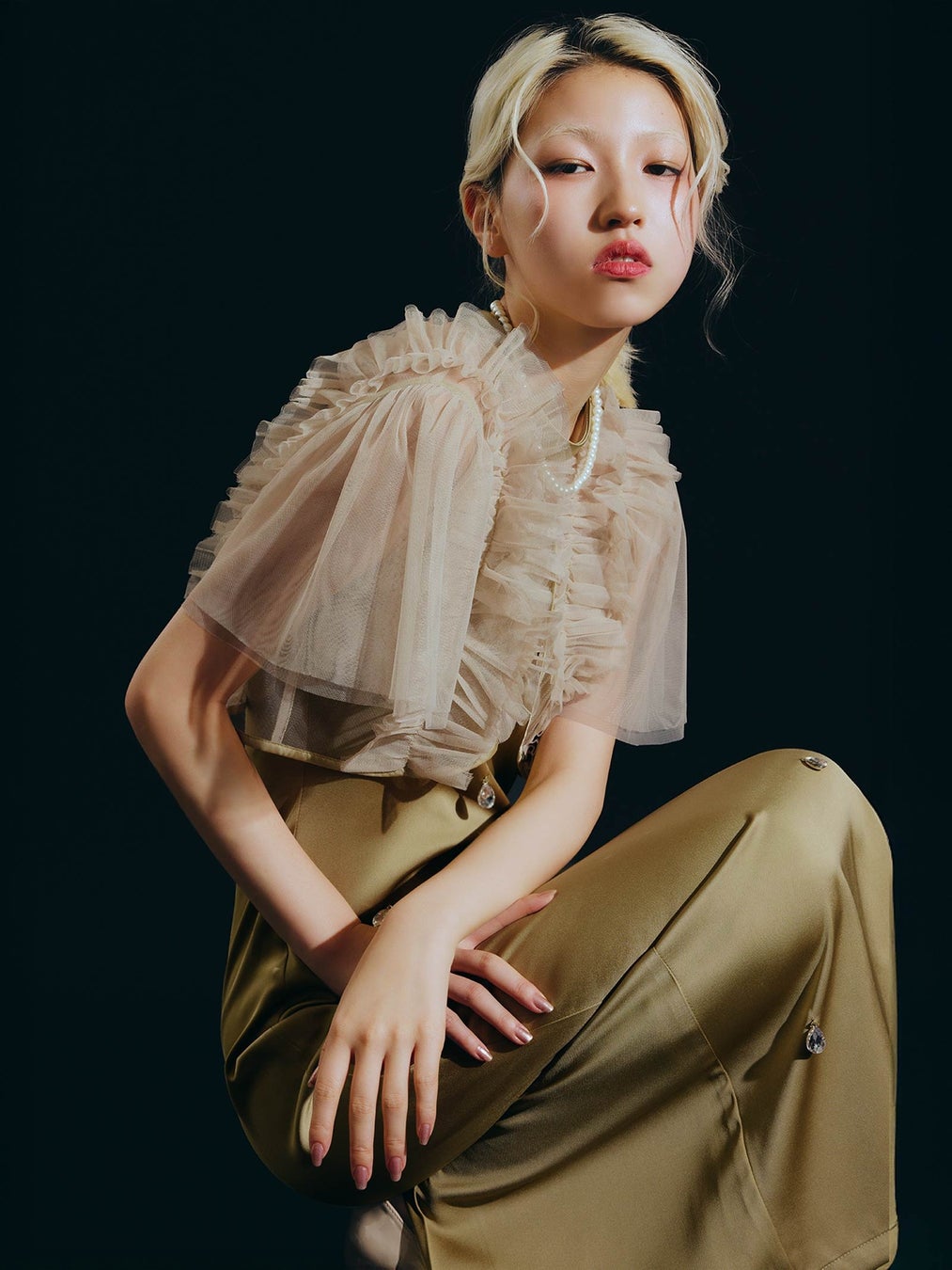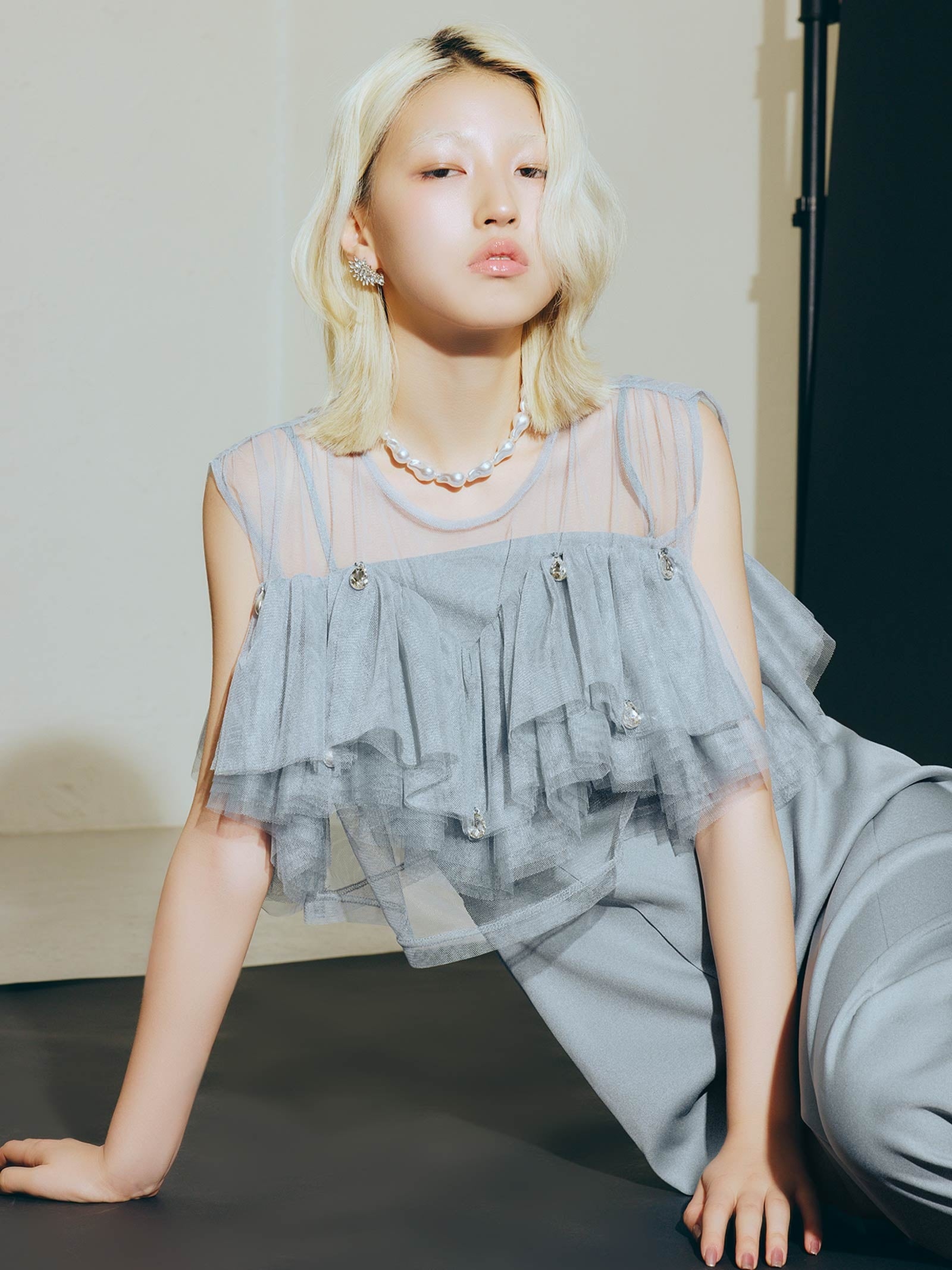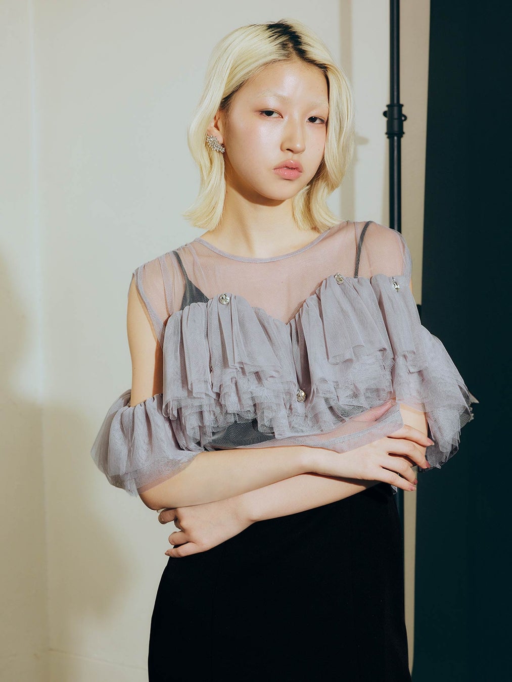 派手すぎずスタイリングの邪魔をしないサイズ感を採用し、唯一無二のチュールトップスが完成しました。