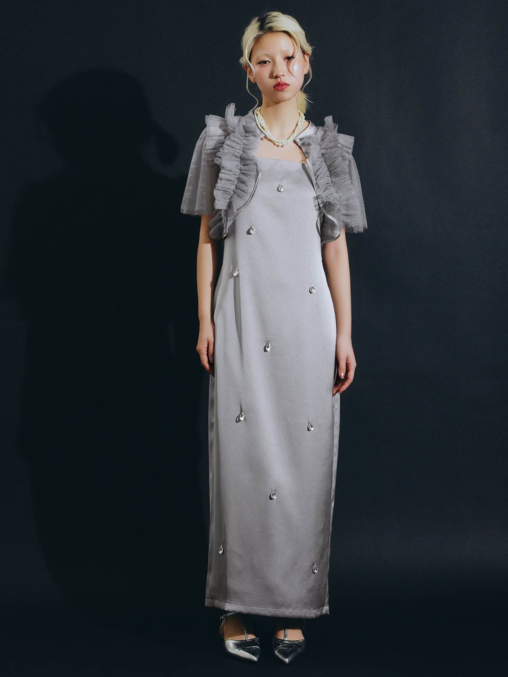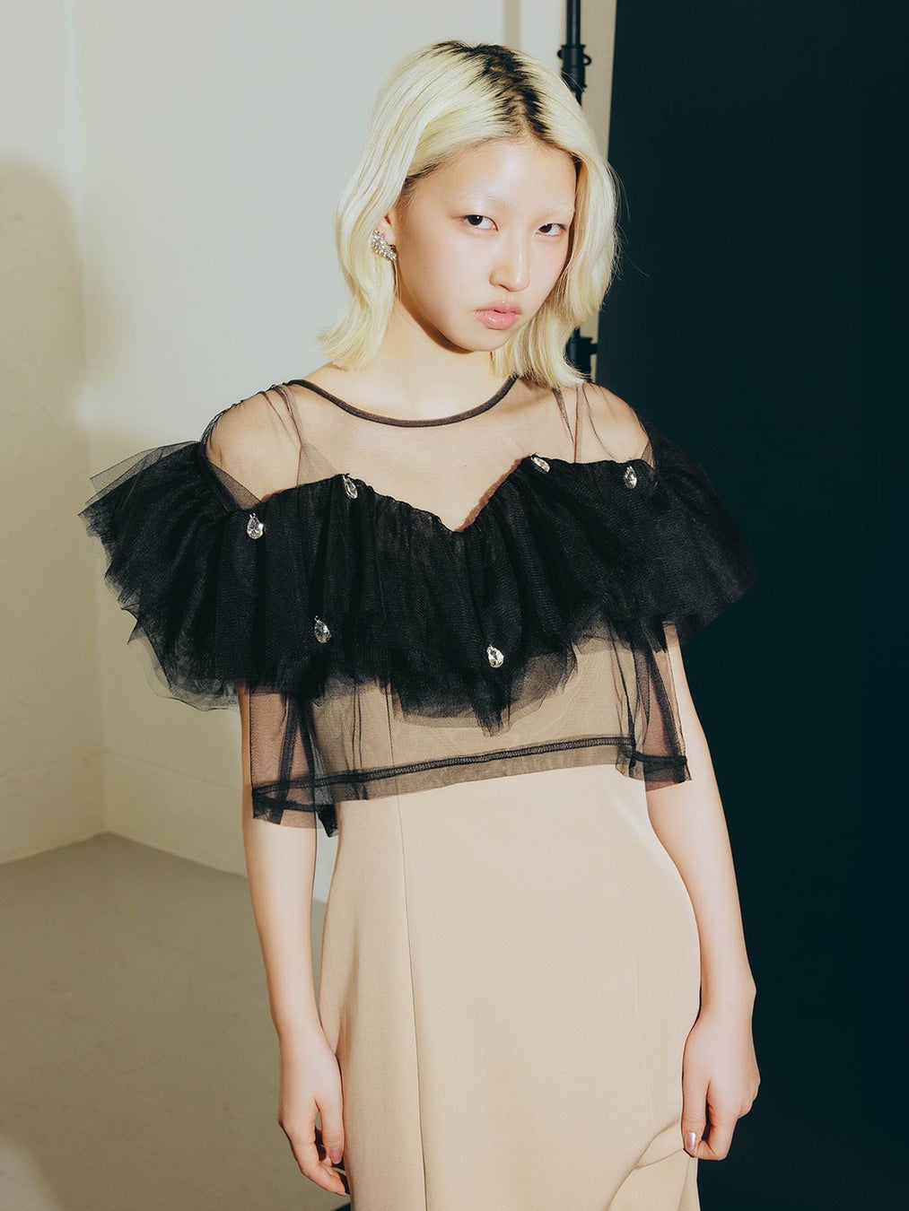 あえて粗めのチュール生地で仕立てることで、フリルのボリュームを維持し存在感のあるルックスに仕上げました。