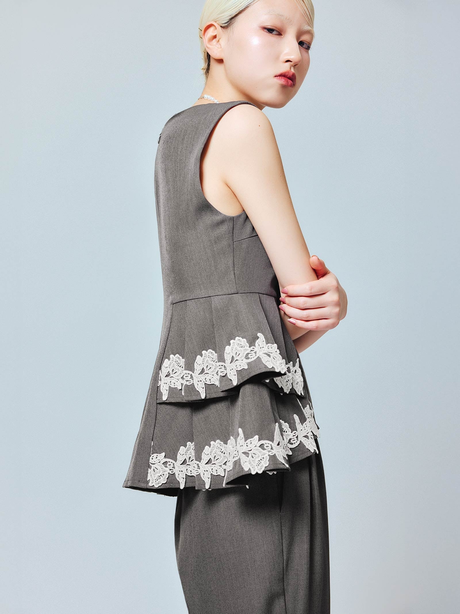 こちらもレース切り替えを施し、単品使用でもお洒落度の高い1枚に。