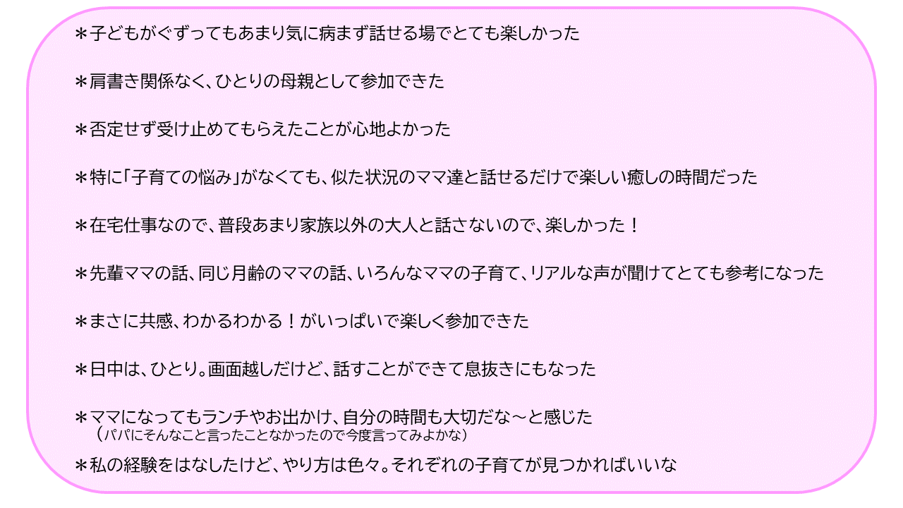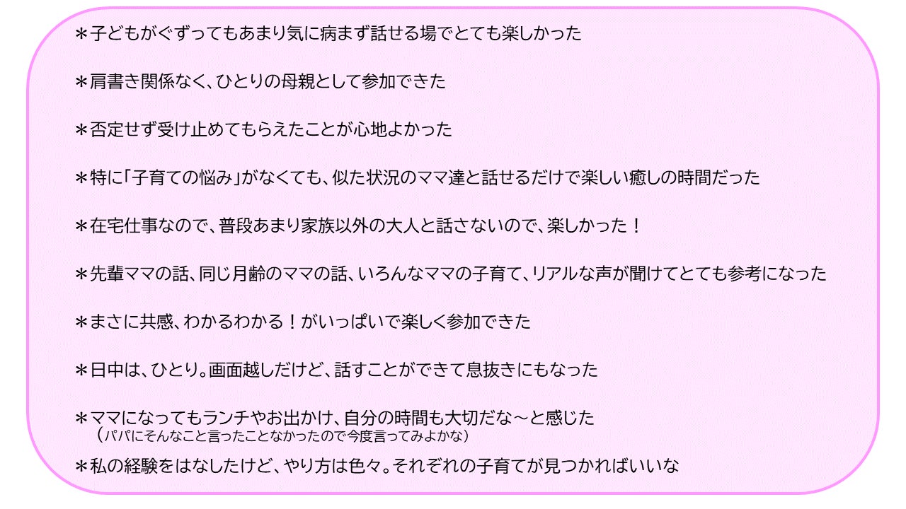 参加したママたちは、自分の経験、思いをありのまま語り、他の人の話を聴くことにより、自己理解を深め、その後の自分に活かしています。