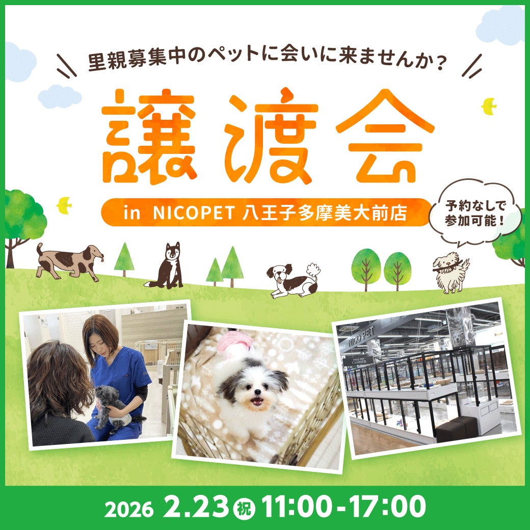 “Pets always come first”を理念に掲げるペッツファーストホールディングス株式会社(本社:東京都目黒区、代表:坂本 晴彦 以下、ペッツファーストグループ)は、スーパービバホーム八王子多摩美大前店内「NICO PET八王子多摩美大前店」にて、2026年2月23日に譲渡会を開催いたします。