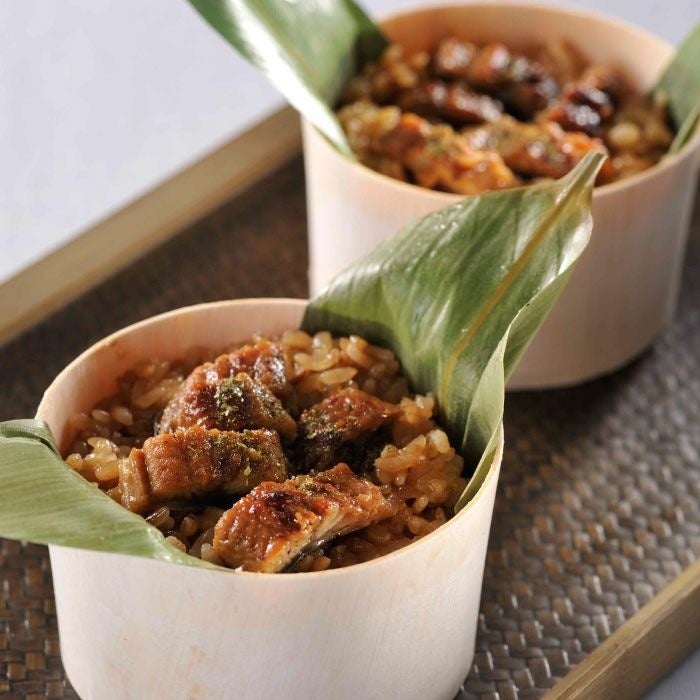 目利きが厳選した国産鰻を甘辛ダレで焼き上げ、おこわにのせました。おこわはもち米とうるち米を独自に配合、鰻タレに漬け込んで味を染み込ませ、せいろで蒸し上げています。木の器のままレンジで温めると、笹の香りが広がり、深みのある味わいに。