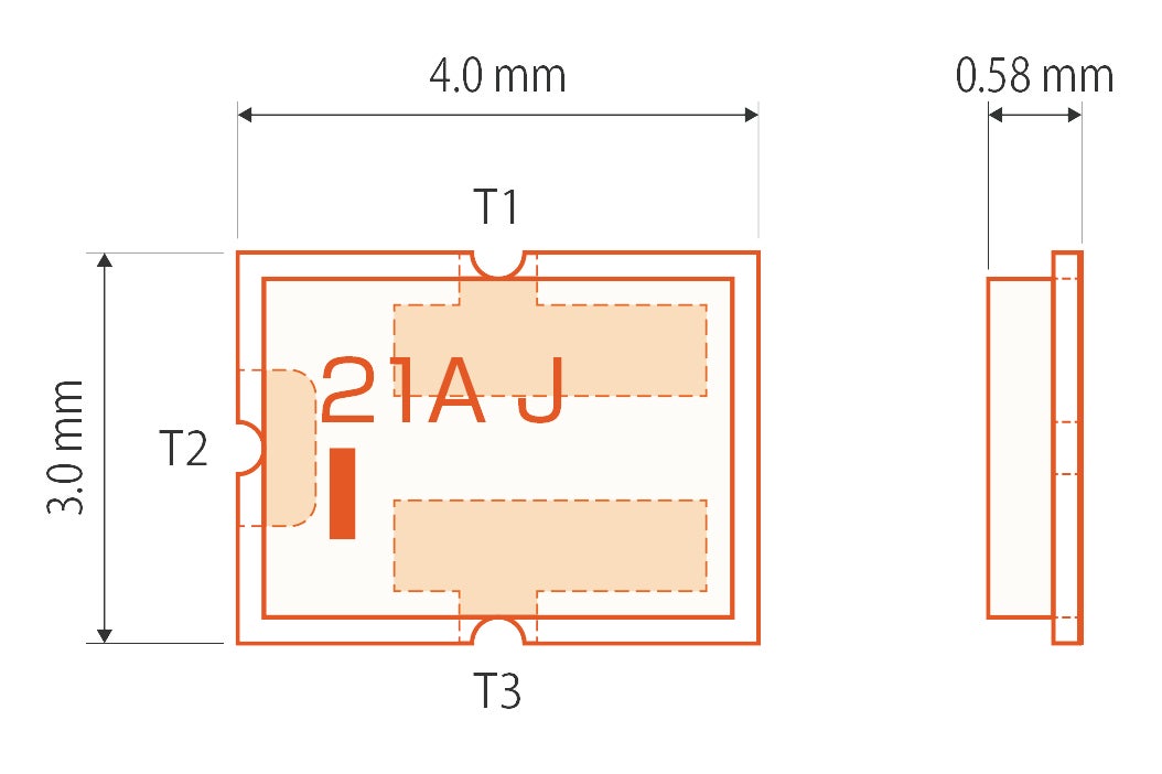 二次保護用の表面実装型ヒューズとしては世界最薄となる4.0mm、縦幅3.0mm、厚み0.58mmの製品サイズで、当社従来品比で31%の薄型化を実現
