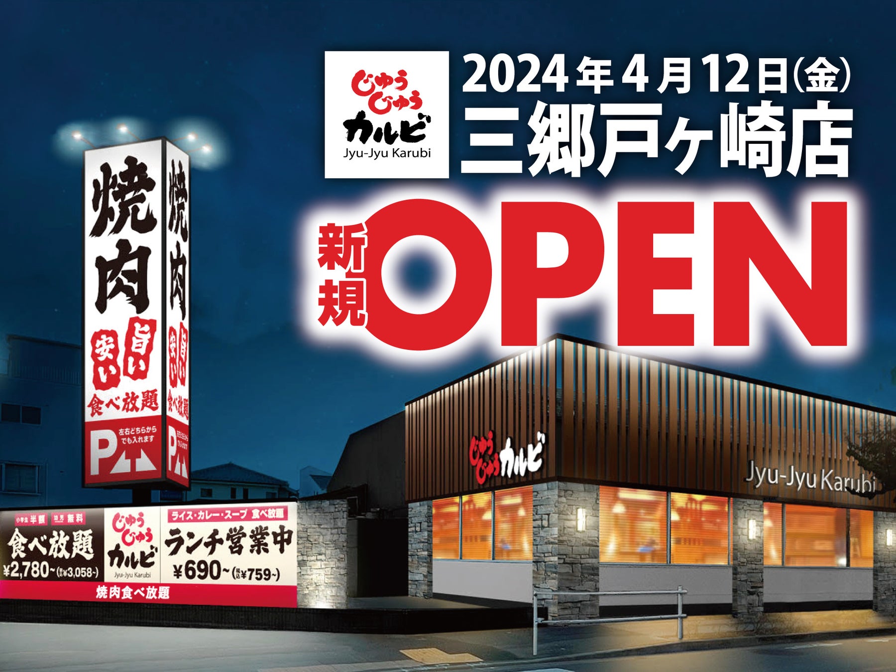 【新店オープン】焼肉食べ放題「じゅうじゅうカルビ 三郷戸ヶ崎店」が4月12日(金)にグランドオープン!