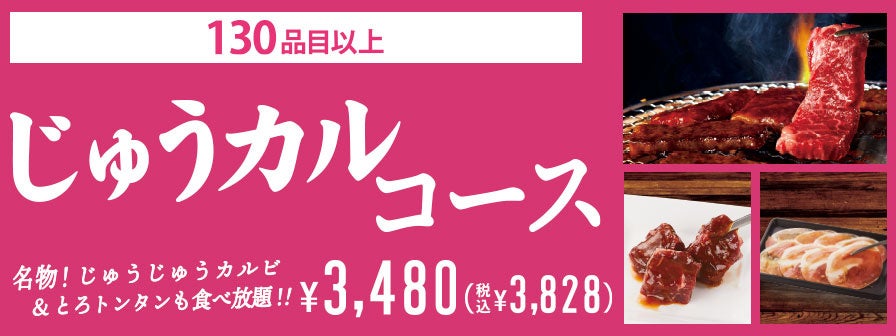 じゅうじゅうカルビおすすめの「じゅうカルコース」は、当店おすすめのカルビBIG3である「“希少部位”とろカルビ」「超ドラゴンカルビ」「旨辛ダレ絶品カルビ」の他、名物の「じゅうじゅうカルビ」など130種類以上を堪能できる食べ放題コースです。
