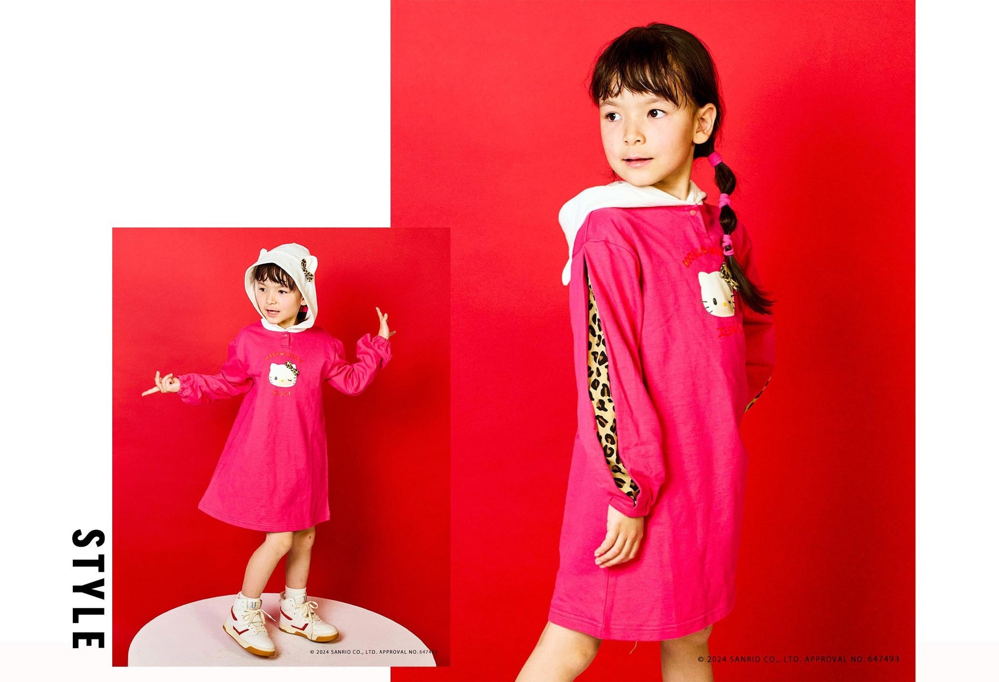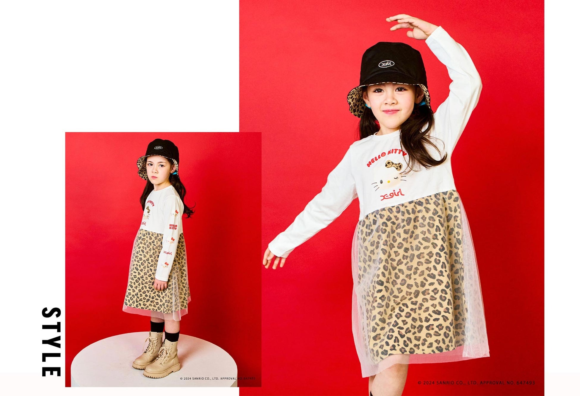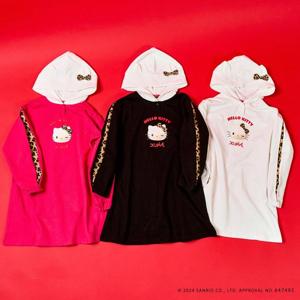 ハローキティになりきりできる、リボン耳付きフードのワンピース♪胸元のキティちゃんにあしらわれた、立体的なリアルリボンもポイントです。袖の切替からさりげなくのぞく、レオパード柄がX-girl Stages らしいデザインでおしゃれ☆