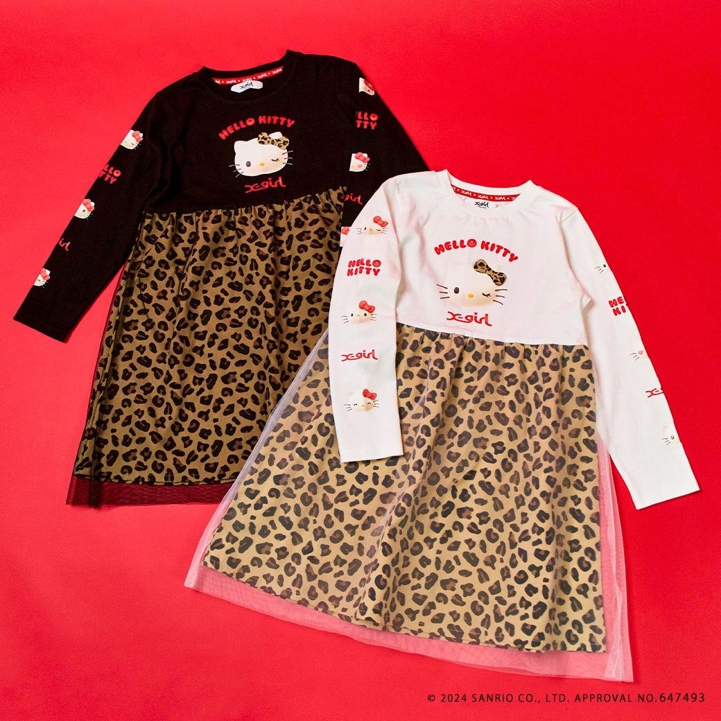 レオパード柄との組み合わせがブランドらしい1着☆胸元のキティちゃんにあしらわれた、立体的なリアルリボンもポイントです。両袖に色々な表情のハローキティたちがプリントされているので、どの方向から見てもかわいいワンピースです🎶