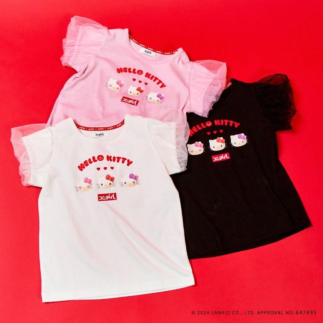 表情の異なるハローキティたちがかわいいTシャツは、存在感のあるふんわりチュール袖がポイントです。コンパクトシルエットなので、ボリュームのあるボトムスとの相性も◎