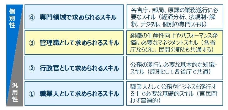 特に③に分類されたスキル項目は、民間企業の管理職に必要とされる「マネジメントスキル」と多くは共通するものであり、民間企業で利用されている研修などのスキル取得・開発手法が活用できうると結論づけた。