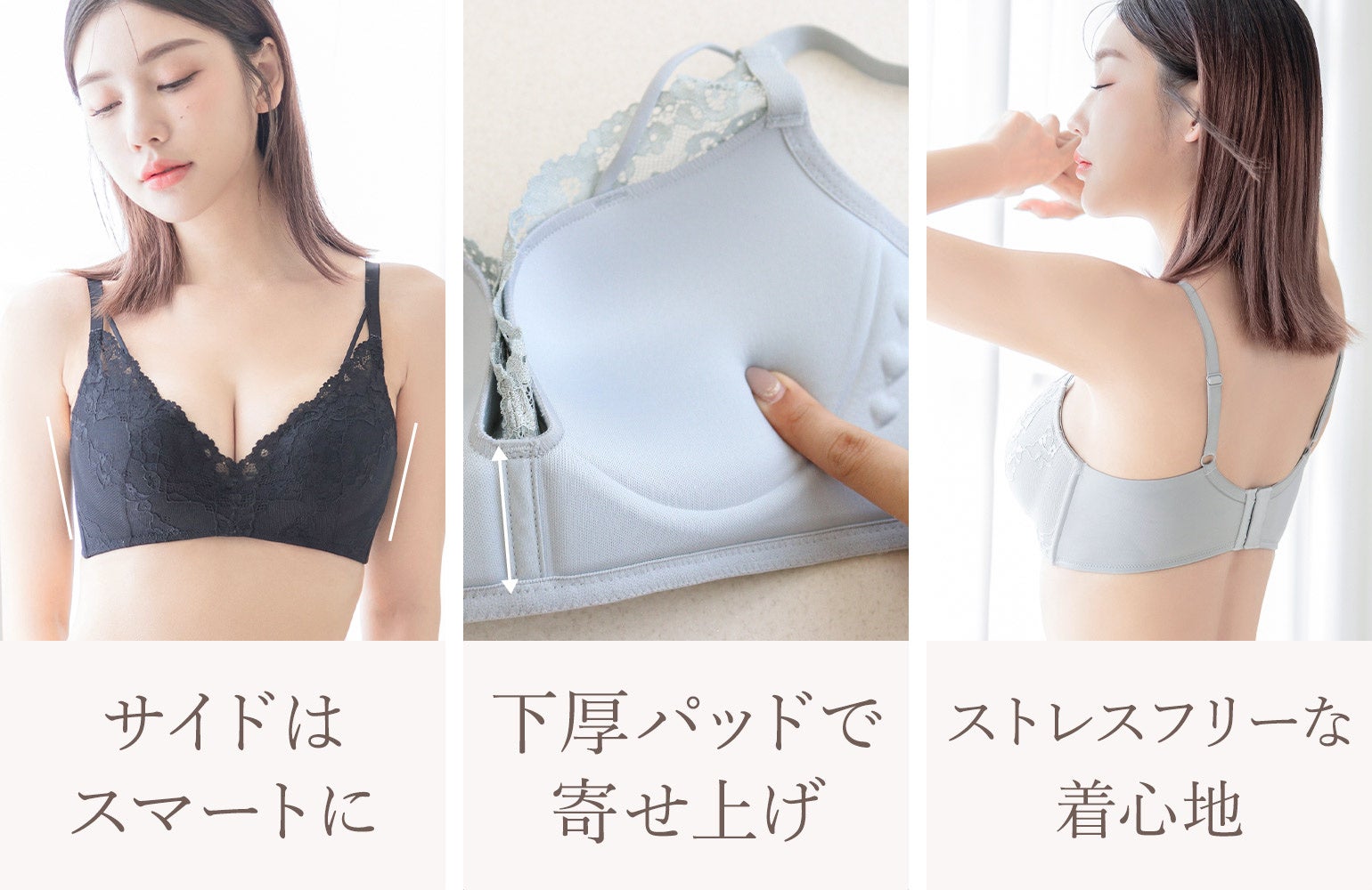 ノンワイヤーで軽い着け心地でありながら、バストを中央へ引き寄せ、高さのあるバストラインへ導きます。さらに、脇高設計でバストの横広がりを抑えることで、サイドはスッキリとしたラインに。