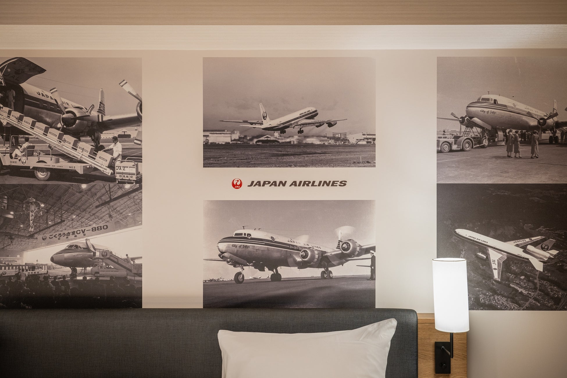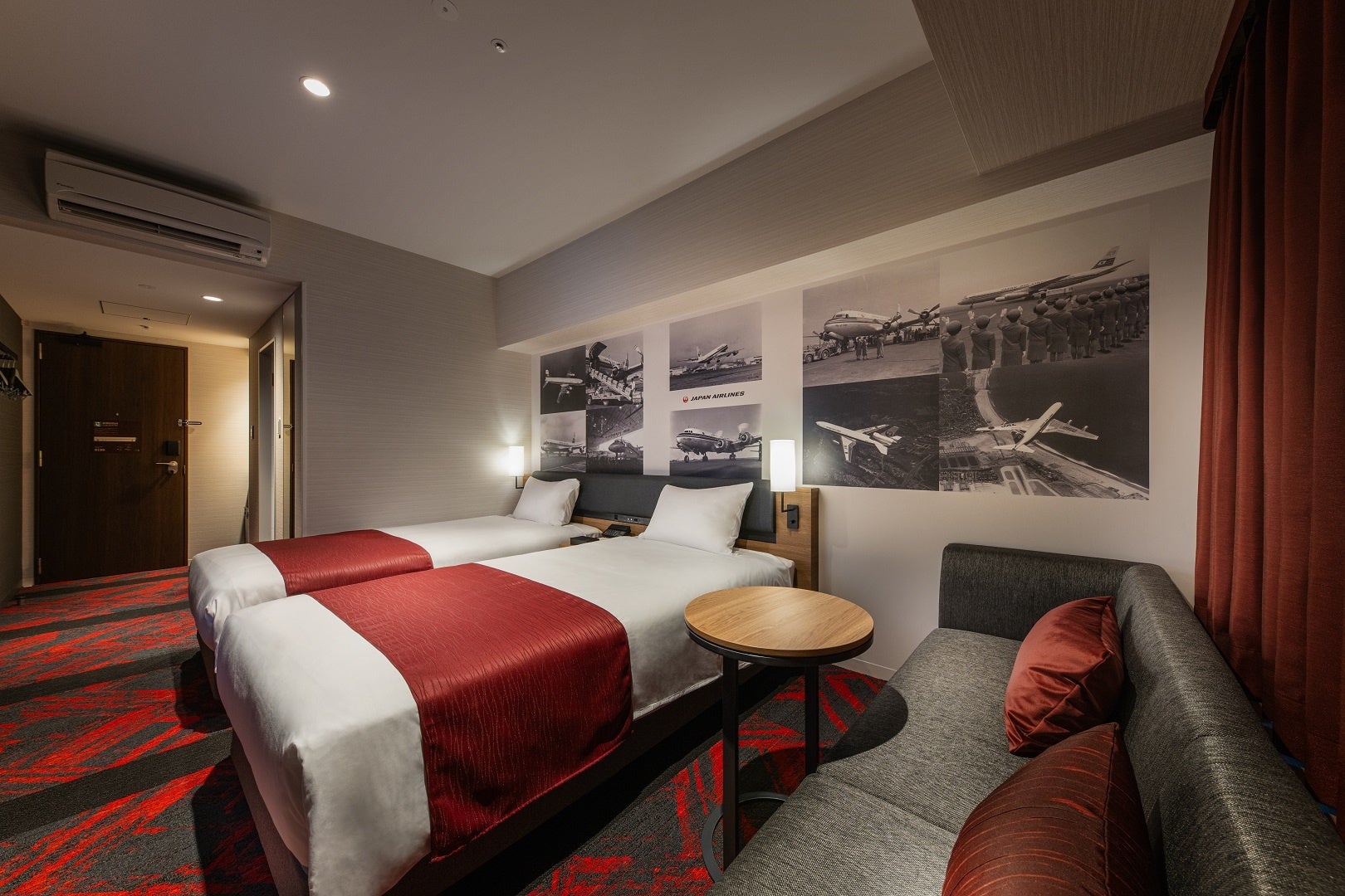 室内はJALキャビンをイメージした「赤×黒×白」を基調とした装飾で、壁面クロスには初めての国際線定期路線就航時に投入されたダグラスDC-6型旅客機の写真をはじめとしたJALが保有する貴重な写真が使用されており、宿泊者限定の記念ノベルティもご用意しております。