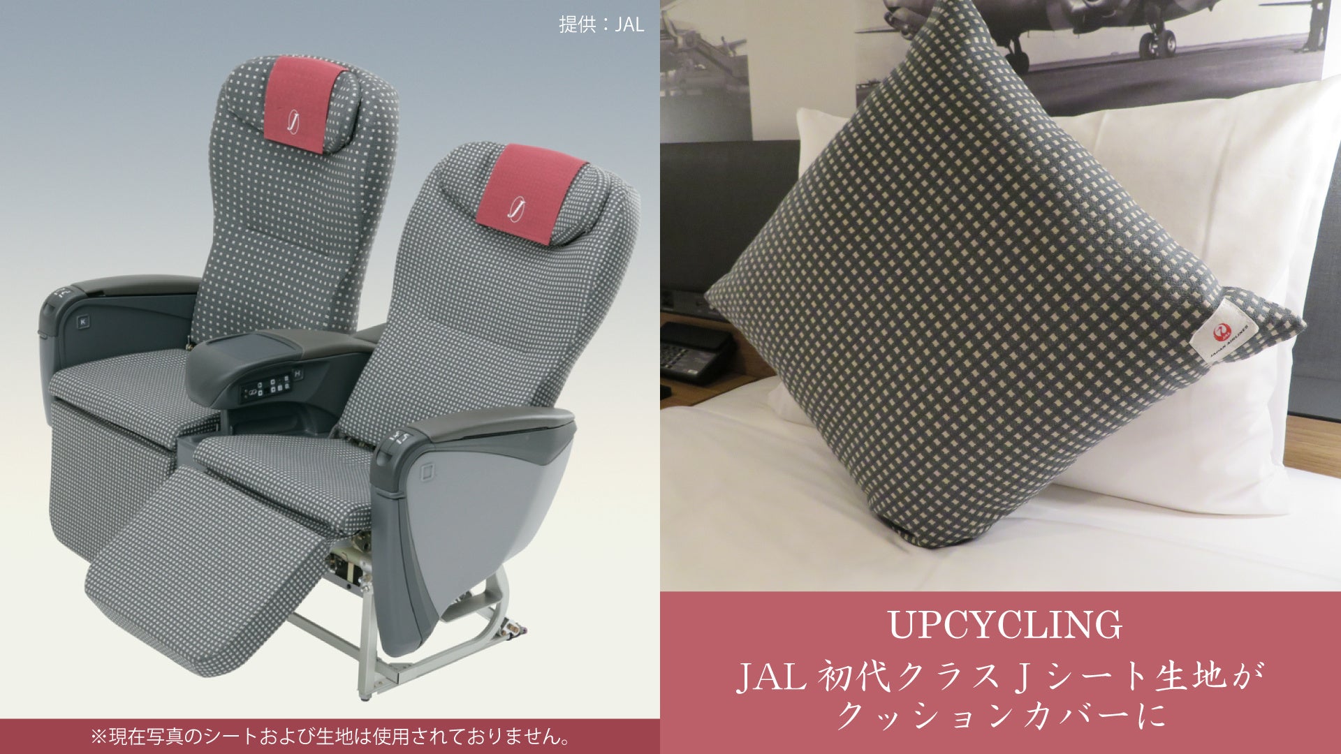 2004年にJALが導入した国内線の初代「クラスJ」。「もっと気軽にくつろぎの空間を、より多くのお客さまにお楽しみ頂きたい。」をコンセプトに生まれ、今なお進化を続けているワンランク上の座席クラスで、初代のシートに採用されていた生地の余剰原反を活用して生まれたアップサイクルのクッションカバーをコラボルームにも採用しています。この度、11月30日までのご宿泊の方に抽選でクッションカバーが当たるキャンペーンを実施いたします。