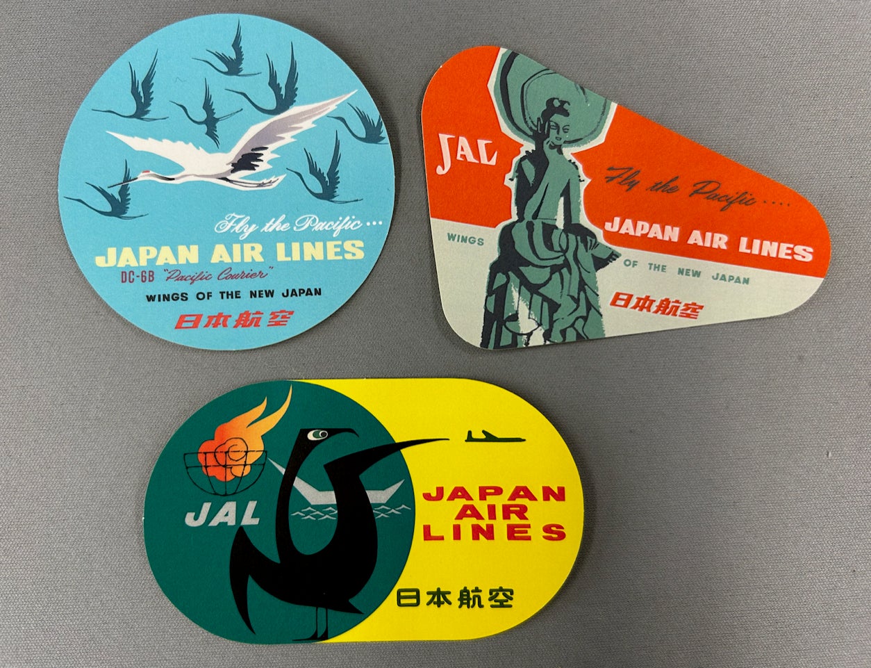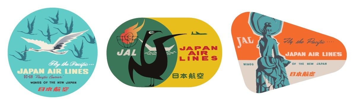 1950年代前半、国際線の就航に舵を切ったJALが時刻表やポスター、機内でのノベルティ配布などのプロモーションで採用した、画家 永井郁氏デザインの3種のイラストを復刻再現。従来ご用意しているノベルティはそのままに、「海を渡る鶴」をモチーフに世界へ羽ばたく「WINGS OF THE NEW JAPAN(新しい日本の翼)」のキャッチフレーズが描かれた3種のステッカーをご用意いたしました。