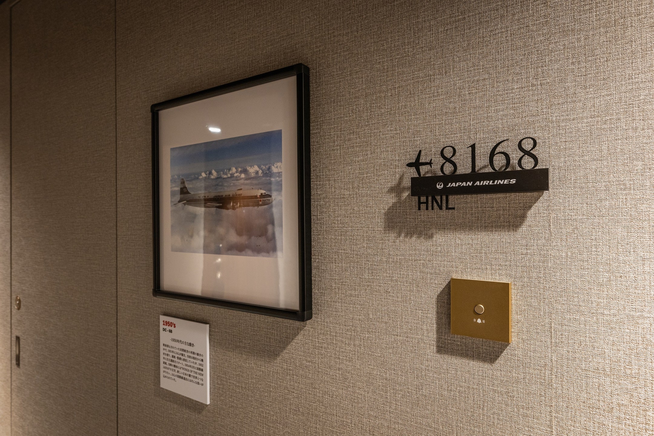さらに、客室へと続く廊下には滑走路を模したデザインとJALの歴史を振り返るパネル展示を実施しており、コラボルームのご宿泊全体を通じて羽田空港から始まった国際線就航の歴史を体感することができます。