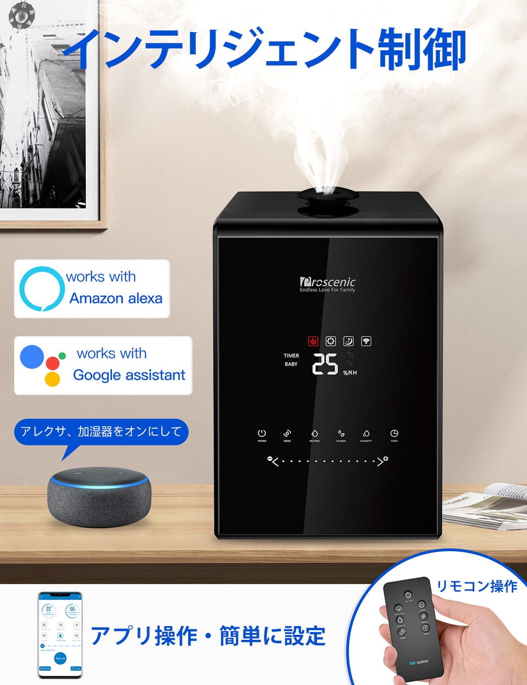 アプリ操作をサポートし、携帯電話で加湿器を制御でき、Alexaと接続することで、 音声コマンドですべての操作を実行でき、より便利でインテリジェントになります。