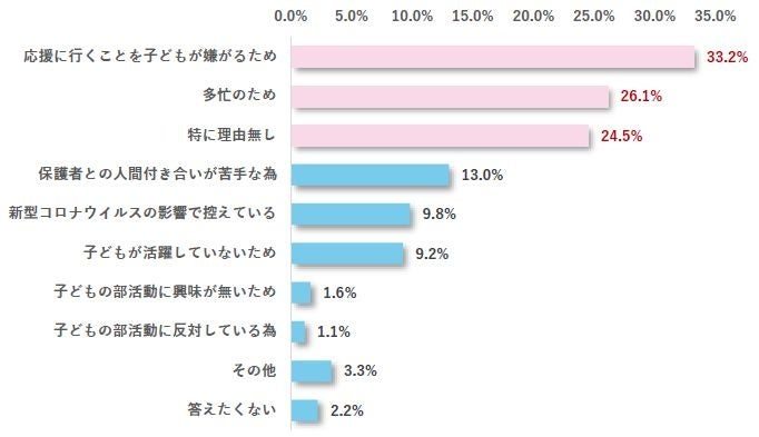 また、子どもの部活動の発表会や試合を見に行かないと回答した184名を対象に、見に行かない理由を質問したところ、最多回答は「応援に行くことを子どもが嫌がるため(33.2%)」、次に「多忙のため(26.1%)」、「特に理由無し(24.5%)」と続きました。