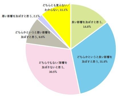 部活動が受験に対してどのような影響を及ぼすと思うか質問したところ、46.7%が「良い影響を及ぼすと思う」(良い影響を及ぼすと思う:14.8%、どちらかというと良い影響を及ぼすと思う:31.9%)と回答しました。