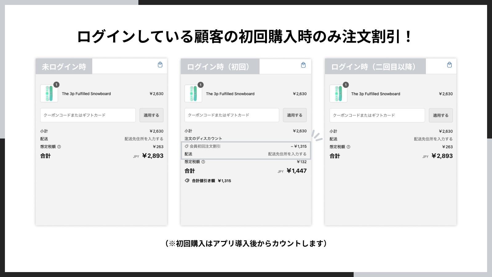 「シンプル会員初回注文割引|お手軽初回ログインセール設定」では、ログインしている顧客の初回購入時のみ注文を割引できます。
