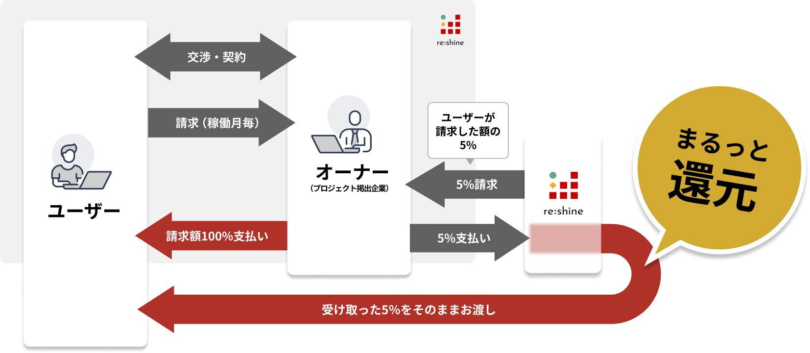 キャンペーン期間中にre:shineを通じて契約を結び、契約企業に請求をしていただくことで、企業から支払われる報酬に加え、re:shineからも請求額の5%を追加でお支払いいたします。