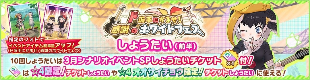 株式会社アピリッツ(本社:東京都渋谷区、代表取締役社長執行役員CEO:和田 順児)は、好評配信中のフレンズたちと“わくわくどきどき探検”するRPG『けものフレンズ3』について、本日2月28日(月)より大型シナリオイベント「ド派手にかませ! 感謝のホワイトフェス」を開催します。