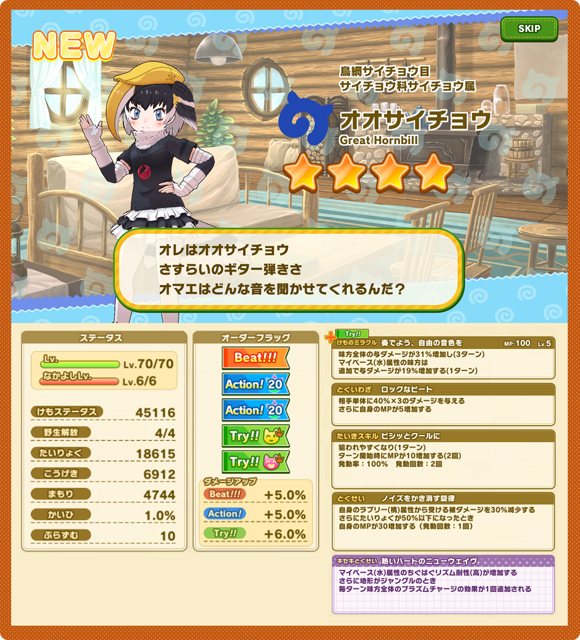 本しょうたいは、☆4「オオサイチョウ」と、新フォト☆4【ロックロック】☆3【パンキッシュ・ビート】の出現確率がアップしている期間限定のしょうたいです。