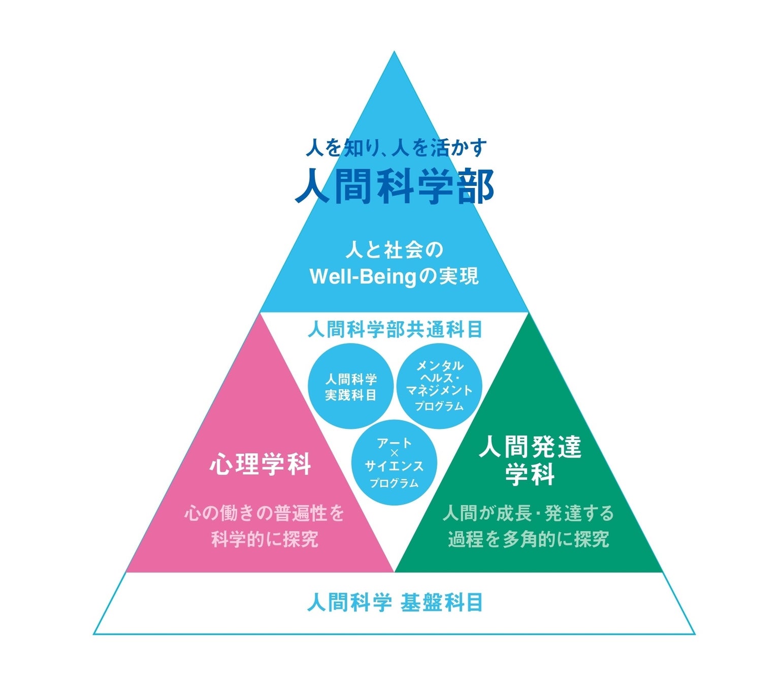 新学部では、両学科の共通科目として「人間科学入門」「人間科学演習」などの基盤科目に加え、「アート×サイエンス・プログラム」「メンタルヘルス・マネジメントプログラム」「人間科学実践科目」などの特色ある幅広い学びを展開する予定です。