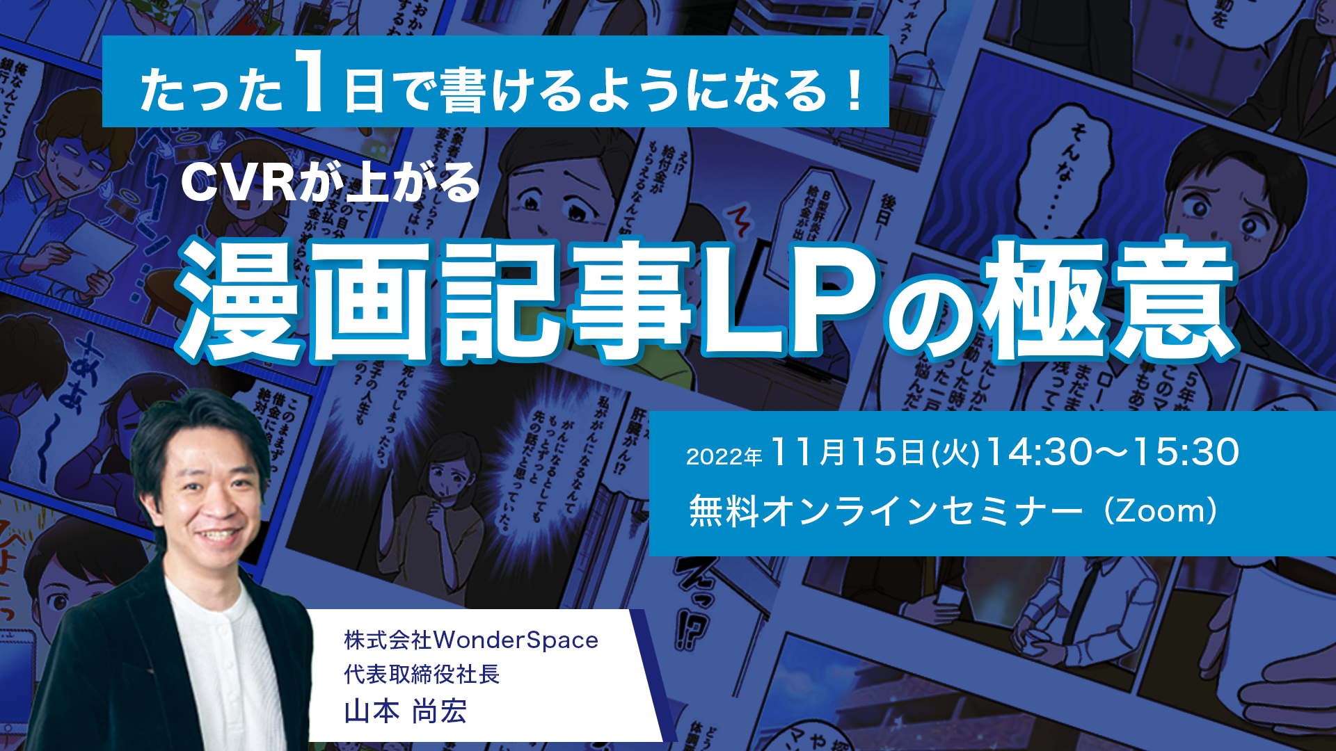 株式会社WonderSpace(本社:東京都港区、代表取締役社長:山本 尚宏)は、『漫画記事LPの制作方法』をテーマにしたオンラインセミナーを11月15日(火)に開催いたします。(お申し込み先: https://wonderspace.co.jp/seminar/seminar-3075/ )