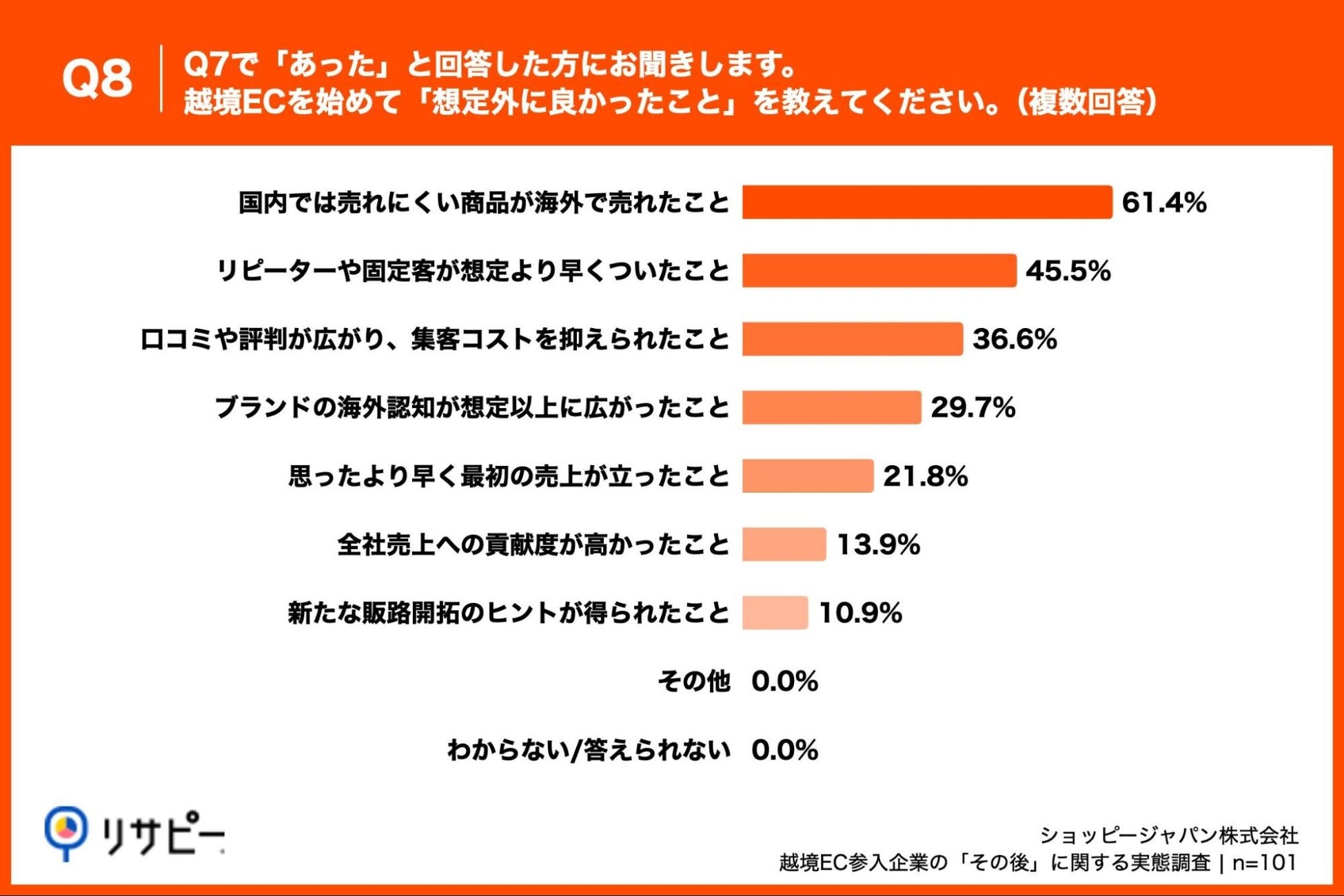 「Q8. Q7で「あった」と回答した方にお聞きします。越境ECを始めて「想定外に良かったこと」を教えてください。(複数回答)」(n=101)と質問したところ、「国内では売れにくい商品が海外で売れたこと」が61.4%、「リピーターや固定客が想定より早くついたこと」が45.5%、「口コミや評判が広がり、集客コストを抑えられたこと」が36.6%という回答となりました。