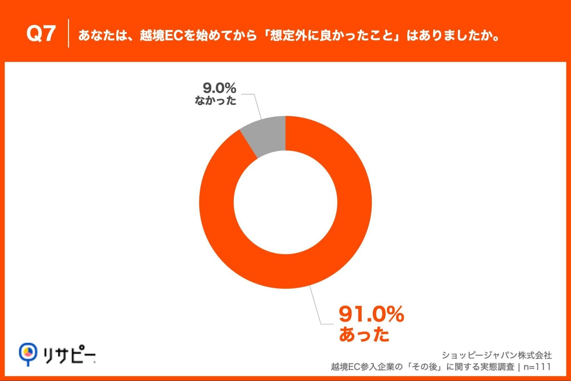「Q7. あなたは、越境ECを始めてから「想定外に良かったこと」はありましたか。」(n=111)と質問したところ、「あった」が91.0%、「なかった」が9.0%という回答となりました。