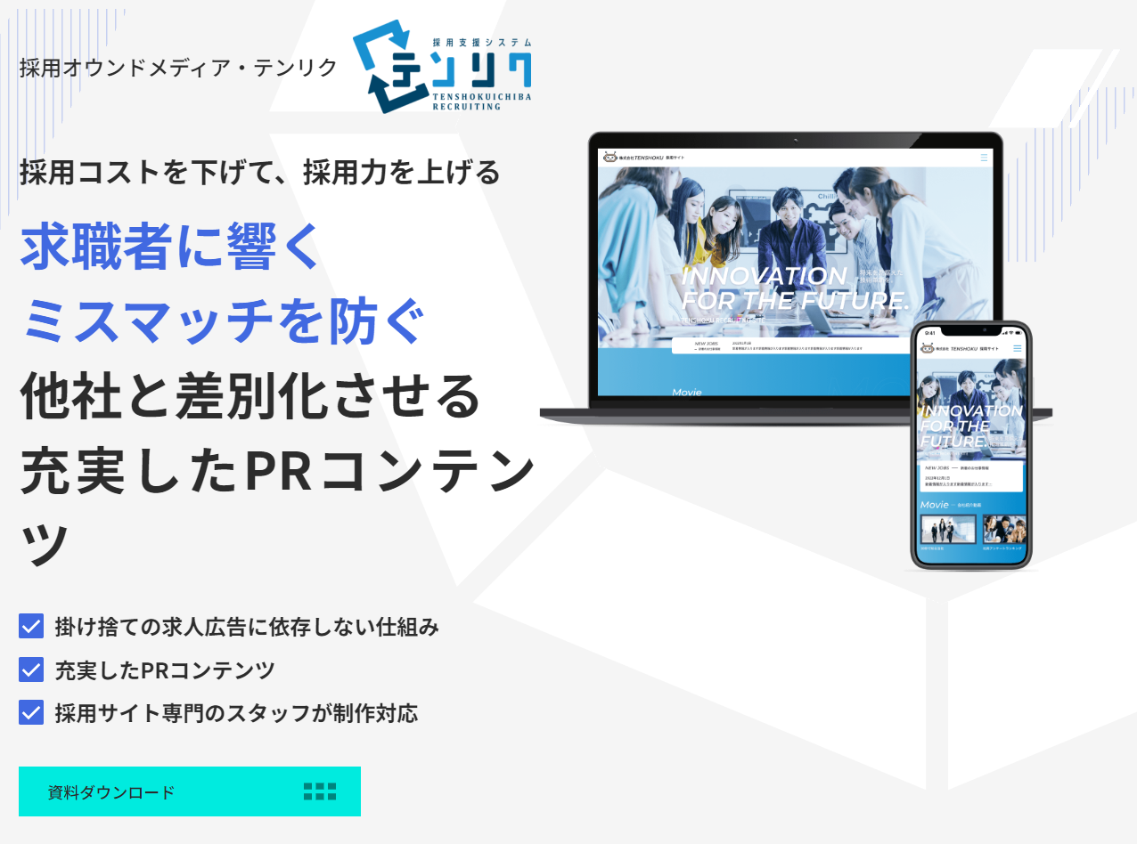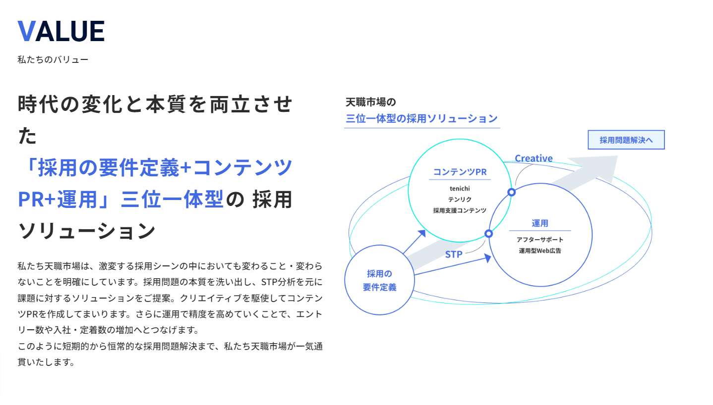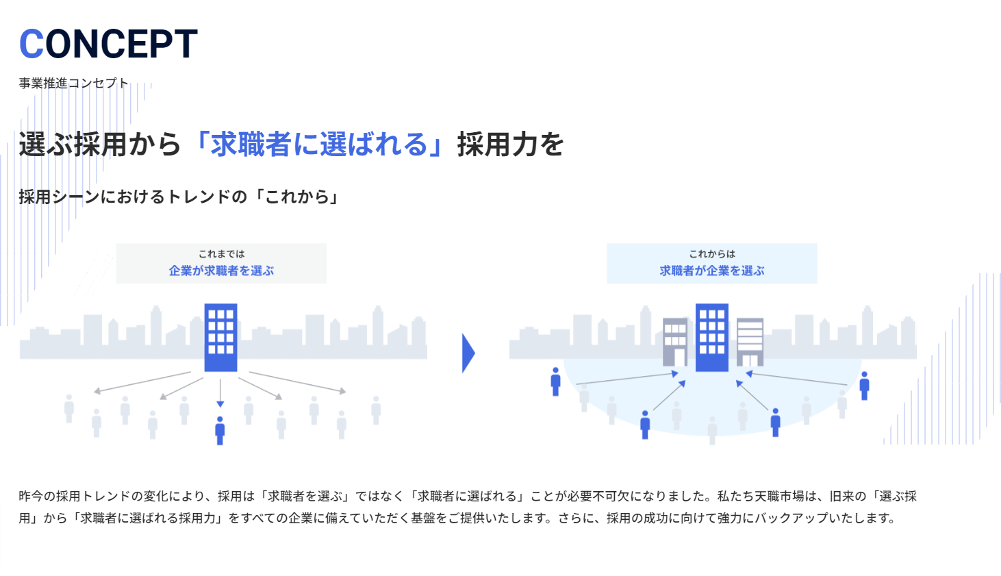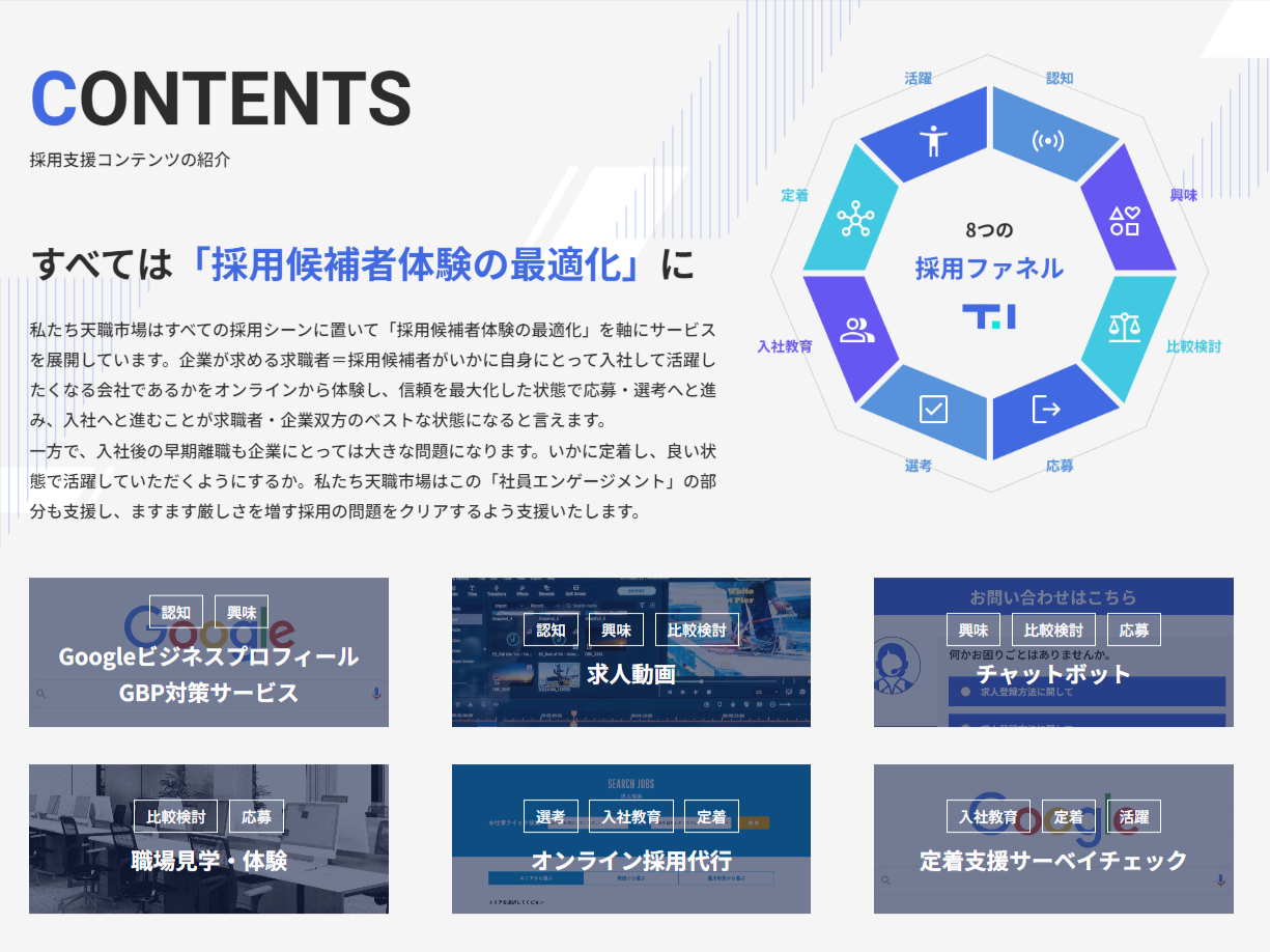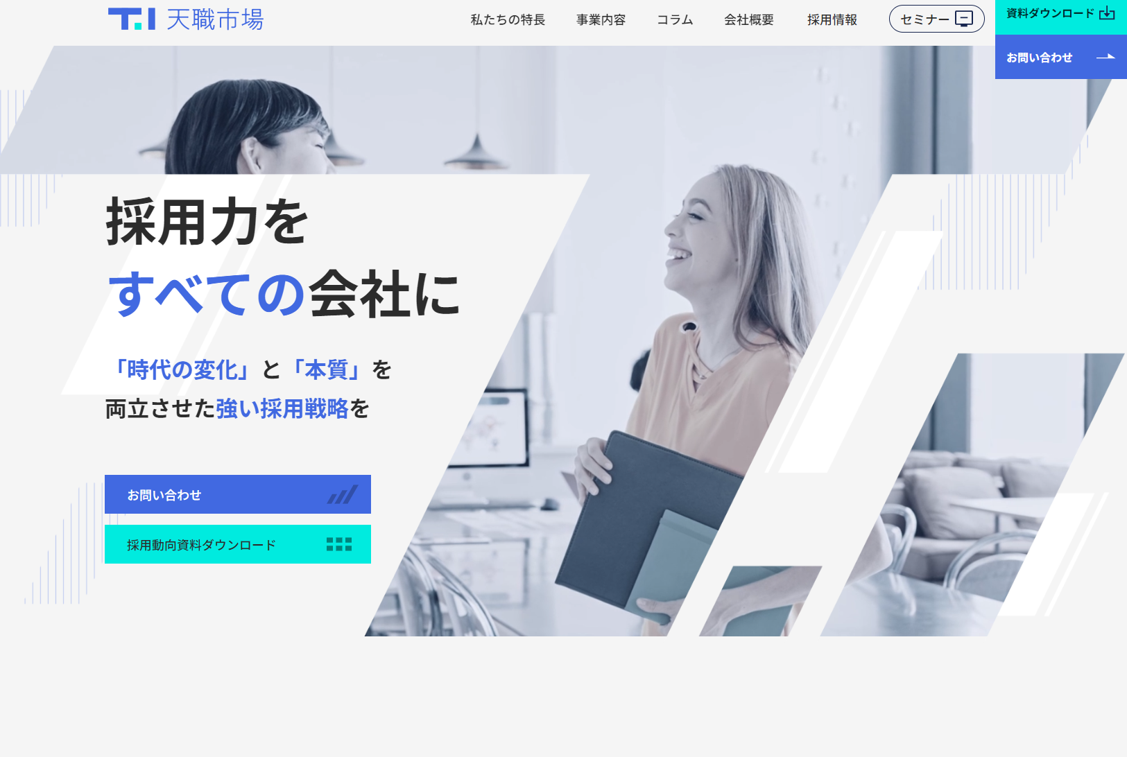 採用力の向上をはかるために、コンテンツやサービス活用において企業と伴走しながら総合的なサービスを提供する天職市場。この機会に活用をご検討ください。