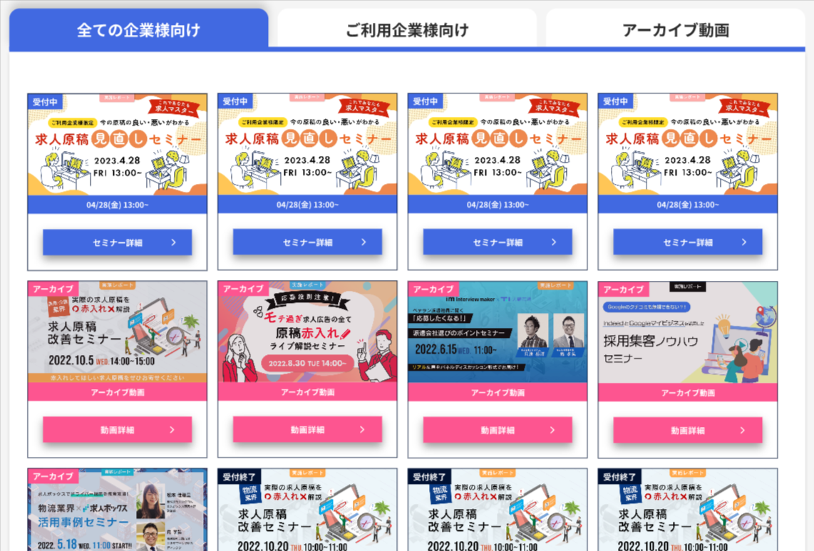 これまでも定期的に開催しているセミナー情報の掲示も引き続き行ってまいりますが、リニューアルを機に事前告知や参加募集だけではなく、開催後にも閲覧できるようアーカイブなども充実させていく予定です。また、既存ユーザーだけではなくはじめてサイトを訪れた新規ユーザーに対しても、天職市場の特徴や採用市場における企業としてのあり方や理念などを理解していただけるよう、企業としてのメッセージを発信していけるコーポレートサイトを目指してまいります。