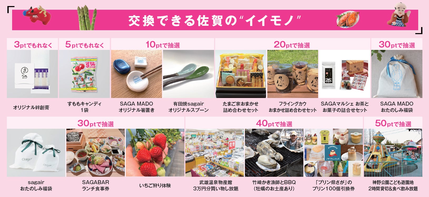 貯まったポイントと交換できる”佐賀のイイモノ” には、もれなくもらえるものと、抽選で当たるものがあり、そのレベルは貯まったポイント数に応じてアップグレード。最大50ポイントまで貯めると、最高レベルの”佐賀のイイモノ”が抽選で当たります。