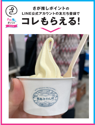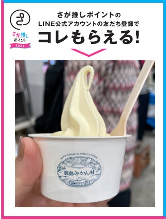 さらに、「さが推しポイント」開始日である2024年5月19日(日曜日)に、SAGAアリーナで開催される「ものスゴフェスタ10」において、「さが推しポイント」のLINE友だち登録および、(公財) 佐賀県産業振興機構「佐賀県産業イノベーションセンター」「九州シンクロトロン光研究センター」いずれかのブースでものづくり体験をし、 「さが県産品流通デザイン公社」ブースで簡単なアンケートにお答えいただくと、もれなく、佐藤農場(佐賀県鹿島市)の有機栽培みかん果汁を使用した、こだわりの“みかんソフトクリーム”をプレゼントするキャンペーンを実施します。