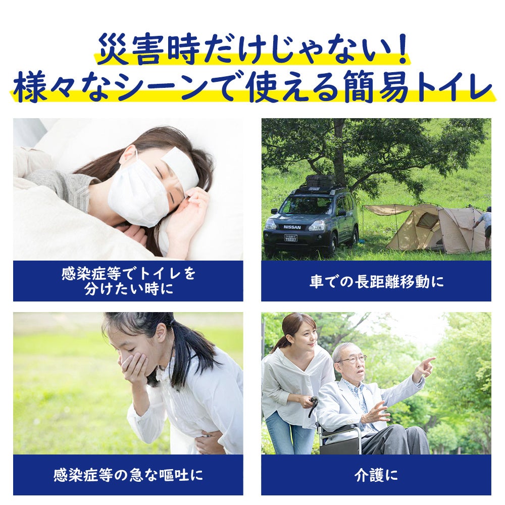 組み立ての必要がなく、すぐに使える簡易トイレです。15年の長期保管が可能!日本国内での消臭・抗菌試験にも合格した凝固剤を採用しているため、清潔にお使いいただけます。フック陳列にも対応したパッケージで店頭販売用としても活用できるタイプです。