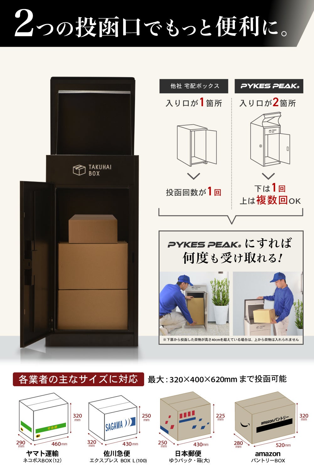 - 2つの投函口で何度でも投函可能。非対面の荷物受け取りをより快適に。