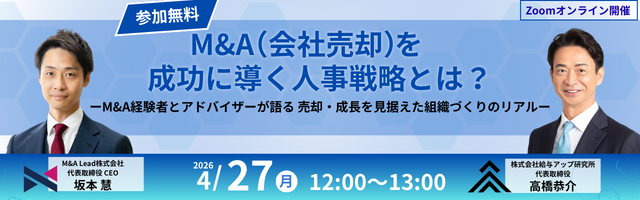株式会社給与アップ研究所(本社:東京都千代田区、代表取締役:高橋 恭介)は、M&A Lead株式会社(本社:東京都千代田区、代表取締役:坂本 慧)とともに、2026年4月27日12:00より、「M&A(会社売却)を成功に導く人事戦略」をテーマとした無料オンラインセミナーを開催いたします。