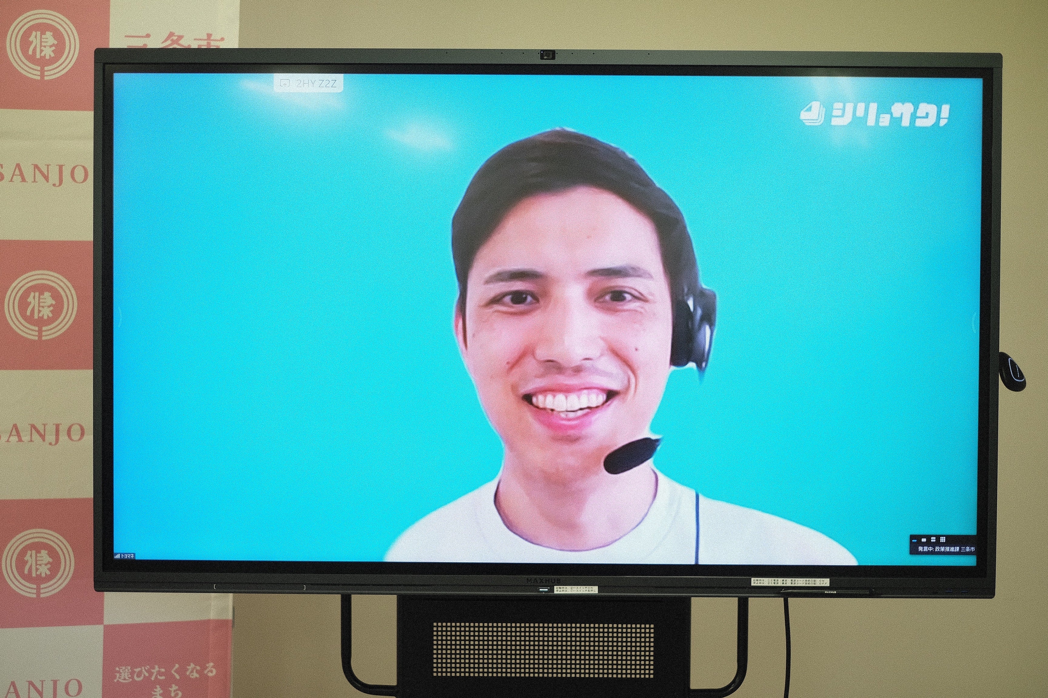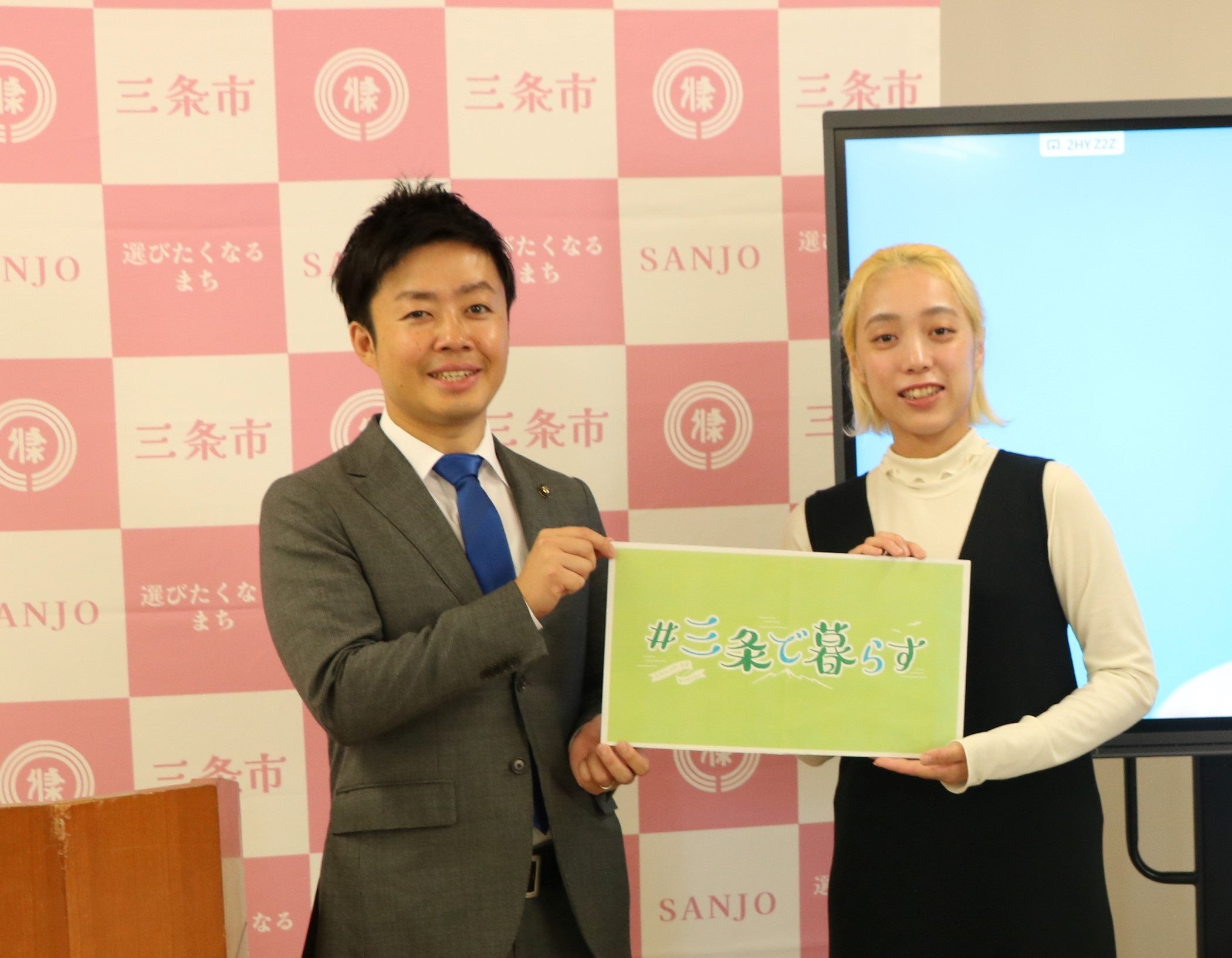 市長記者会見の様子。左から、三条市長 滝沢 亮、ちゃんはる氏(株式会社Camp)