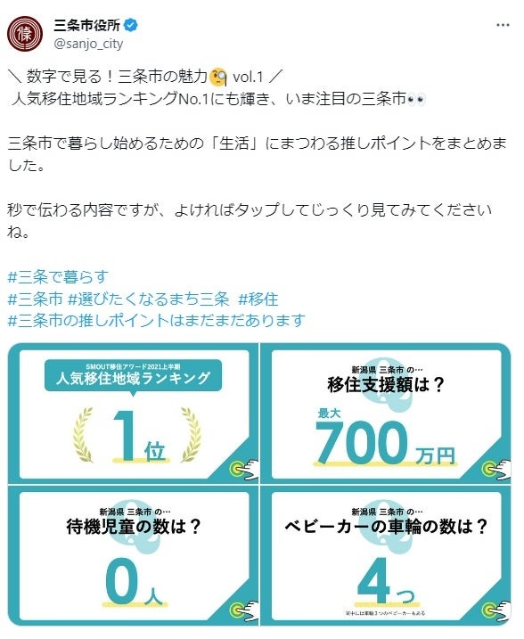 三条市公式X(@sanjo_city)とnote「三条で暮らす。」に投稿して発信します。10/2から計3回投稿予定