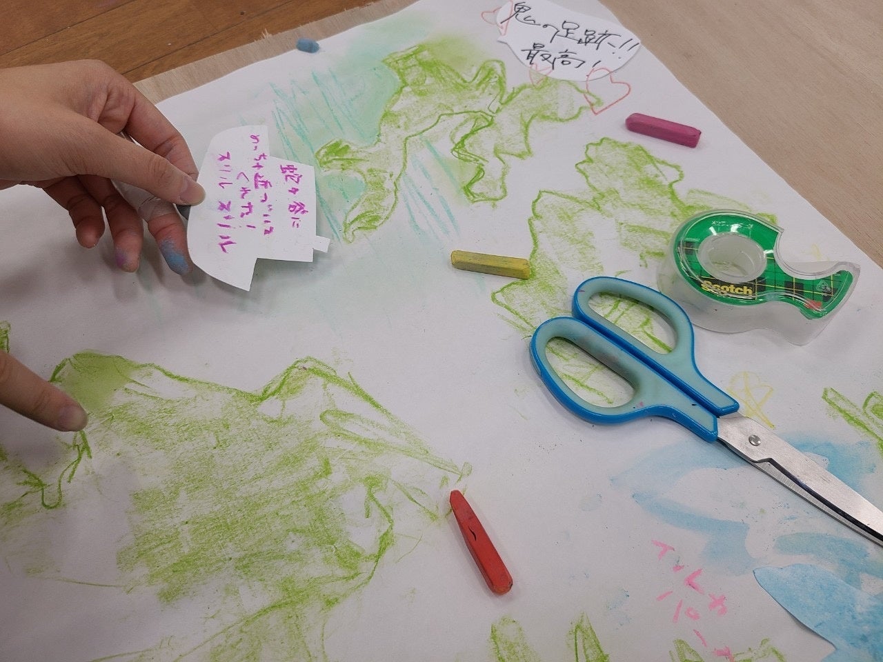 みんなで大きな一枚の地図を描こう!まっさらな壱岐島の地図にあなたが思う壱岐市の好きなところ、エピソードなどを描いて、思い出溢れる大きな地図を作ります。